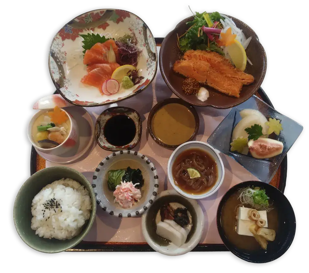 大山サーモンレアカツ/大山サーモン御造り/茶碗蒸し/小鉢/御飯 (鳥取産きぬむすめ) /水菓子
