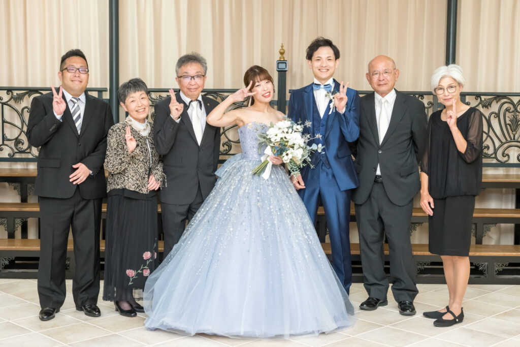 パーティー開宴前にチャペルで家族写真を撮影。和やかな笑顔があふれる素敵なワンシーンです。