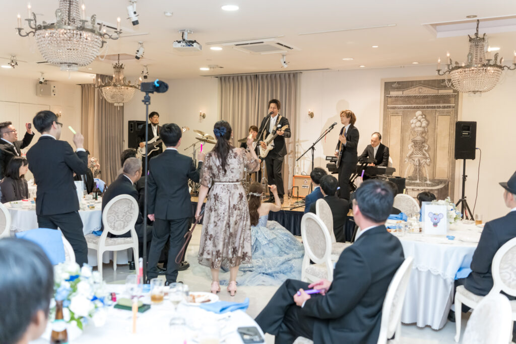 新郎新婦さまも椅子に座らず全力で楽しみ、会場全体が一体となって音楽と笑顔に包まれました。