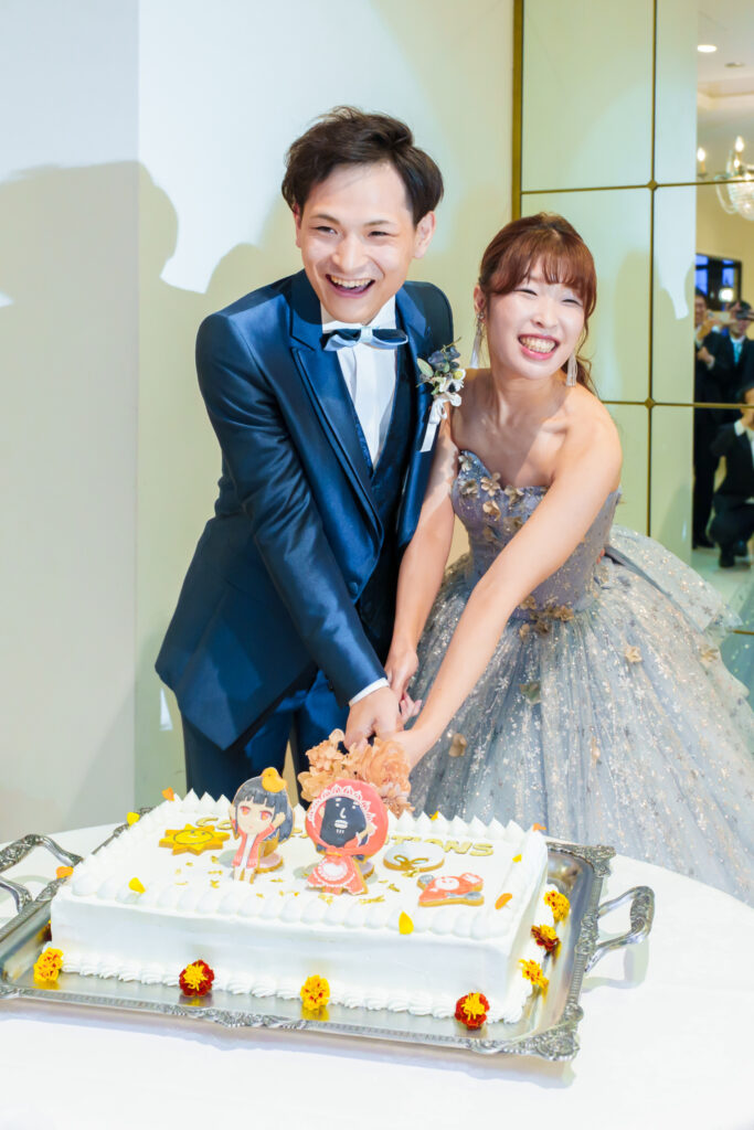 おふたりの共通の趣味であるゲームをモチーフにしたウェディングケーキが登場すると、会場から歓声が!